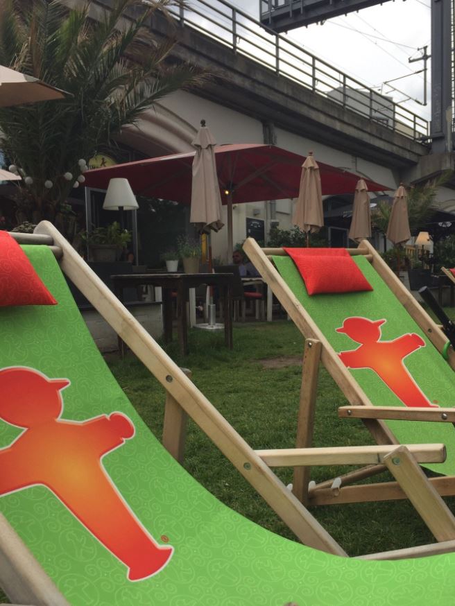 We saw this “beach bar” across the river when visiting the Dom. There were lawn chairs outside with people relaxing and enjoying beers alongside the river. The Ampelmann is an outdoor riverside bar across from Museum Island that gave us a sense of relaxation after our morning filled with museums and stone.