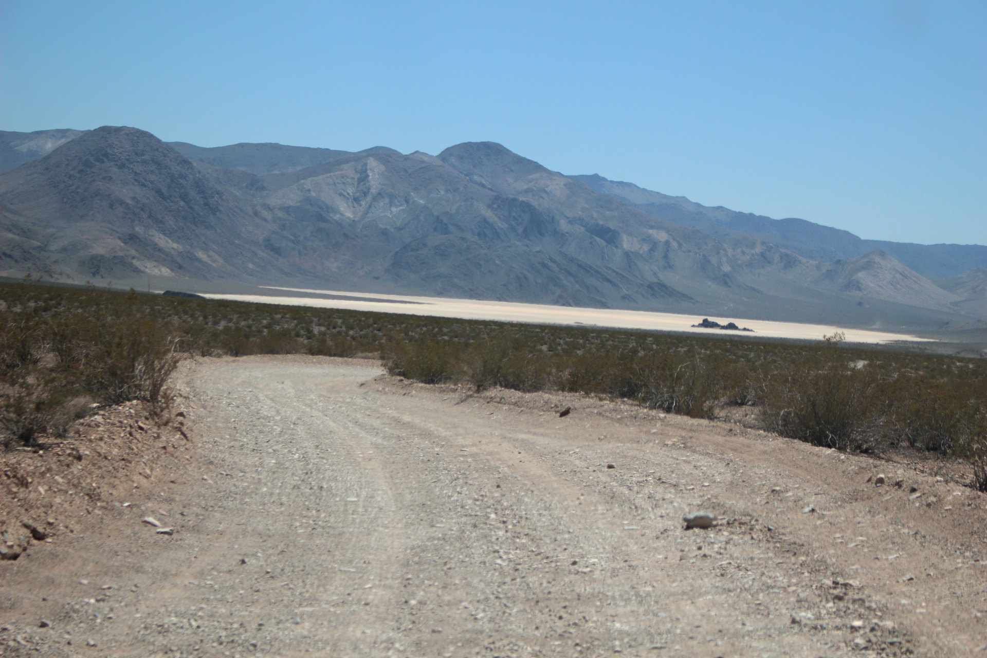 Getting to the Racetrack is about two hours from Ubehebe Crater, and is easy and not so easy to get too. You REALLY have to want to get there to do it. The road is rough and filled with gravel, big and small rocks, and rippled clay soil, making for a very bumpy-slow drive uphill gaining about 3,500 feet in altitude. Our SUV has high clearance and all wheel-drive, but not 4×4 or heavy duty tires, so it took us driving 10-20 mph very carefully down the 30 mile shared road to the racetrack.